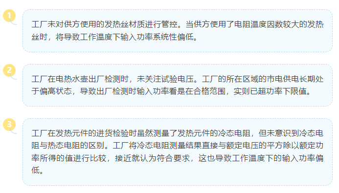 以本案例为例,如果不改变发热丝材质牌号,则额定冷态电阻为30Ω,冷态电阻控制在下限28.8Ω,加严上限31.2Ω,放宽上限32.4Ω为宜。 对照此限值,10个样本中的冷态电阻无一合格。前述勉强合格的6号样本,从冷态电阻-输入功率相关图中可以看到,其输入功率测量结果很有可能是略为偏大的。 至此,我们可以归纳出工厂电热水壶输入功率国抽不合格,主要原因有以下几点: